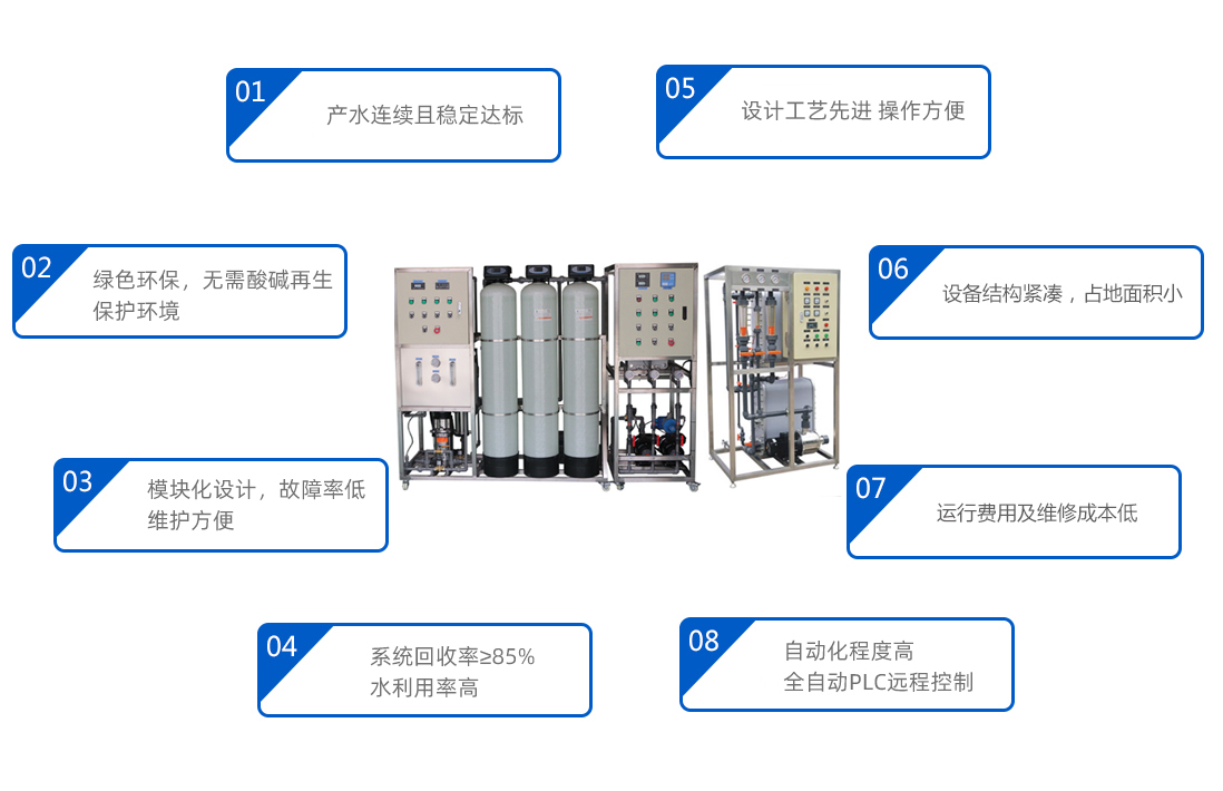 1. 連續產出超純水,出水水質具有最佳的穩定度,以高產率產生超純水(產率可以高達95%)