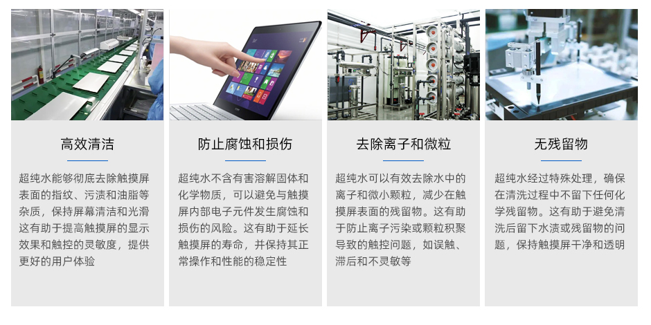 觸摸屏清洗使用超純水設(shè)備能夠徹底去除觸摸屏表面的指紋、污漬和油脂等雜質(zhì),保持屏幕清潔和光滑。這有助于提高觸摸屏的顯示效果和觸控的靈敏度,提供更好的用戶體驗(yàn)