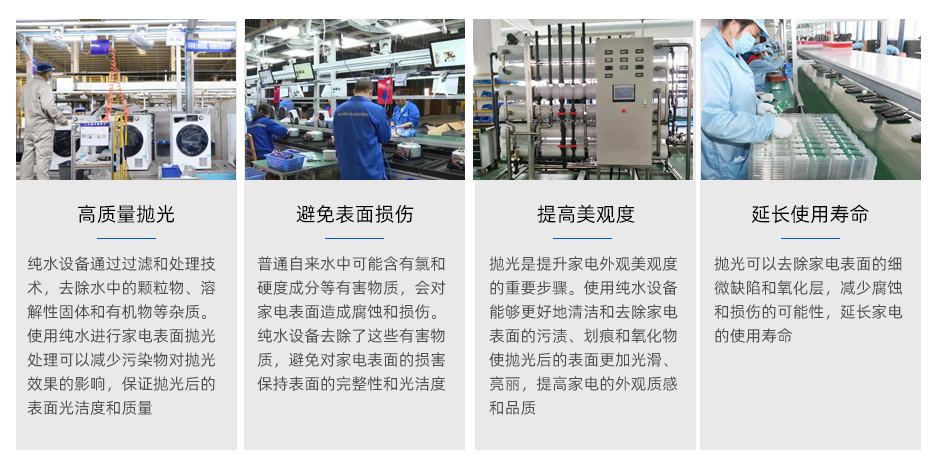 在家電表面拋光處理過程中,使用普通水或其他雜質含量高的水很容易導致表面污染和腐蝕。使用純水可以有效地避免這些問題,從而保證拋光后表面干凈、亮麗,從而提高產品整體質量