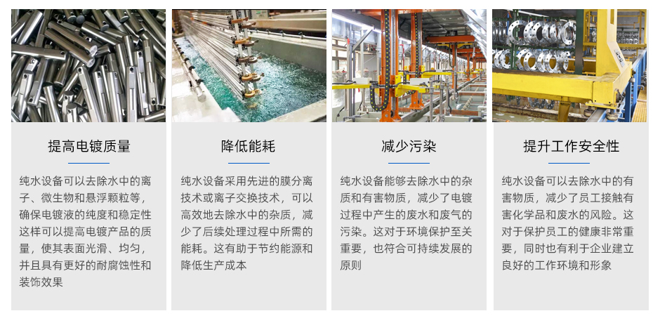在電鍍行業中純水設備可以去除水中的離子、微生物和懸浮顆粒等,確保電鍍液的純度和穩定性。這樣可以提高電鍍產品的質量,使其表面光滑、均勻,并且具有更好的耐腐蝕性和裝飾效果