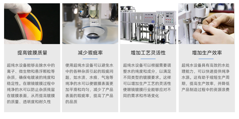 在眼鏡鍍膜過程中,需要使用無雜質的高純度水來清洗和處理眼鏡表面,以便保證涂層的附著力和光學性能。如果使用普通自來水或其他含有雜質和有機物的水,則可能會導致涂層出現氣泡、脫落或者其他不良影響,從而降低產品質量。